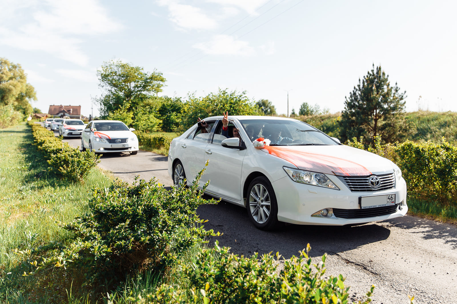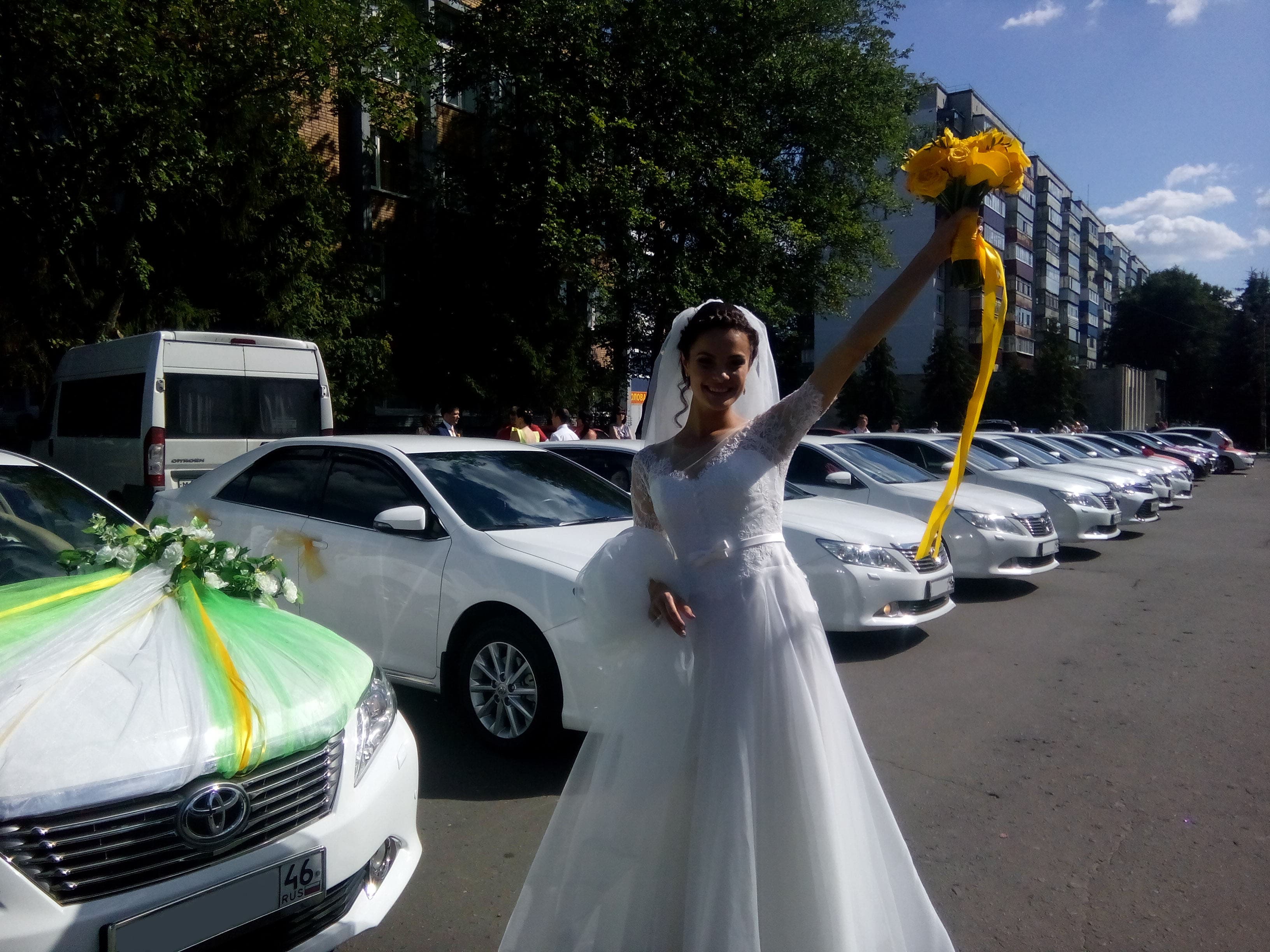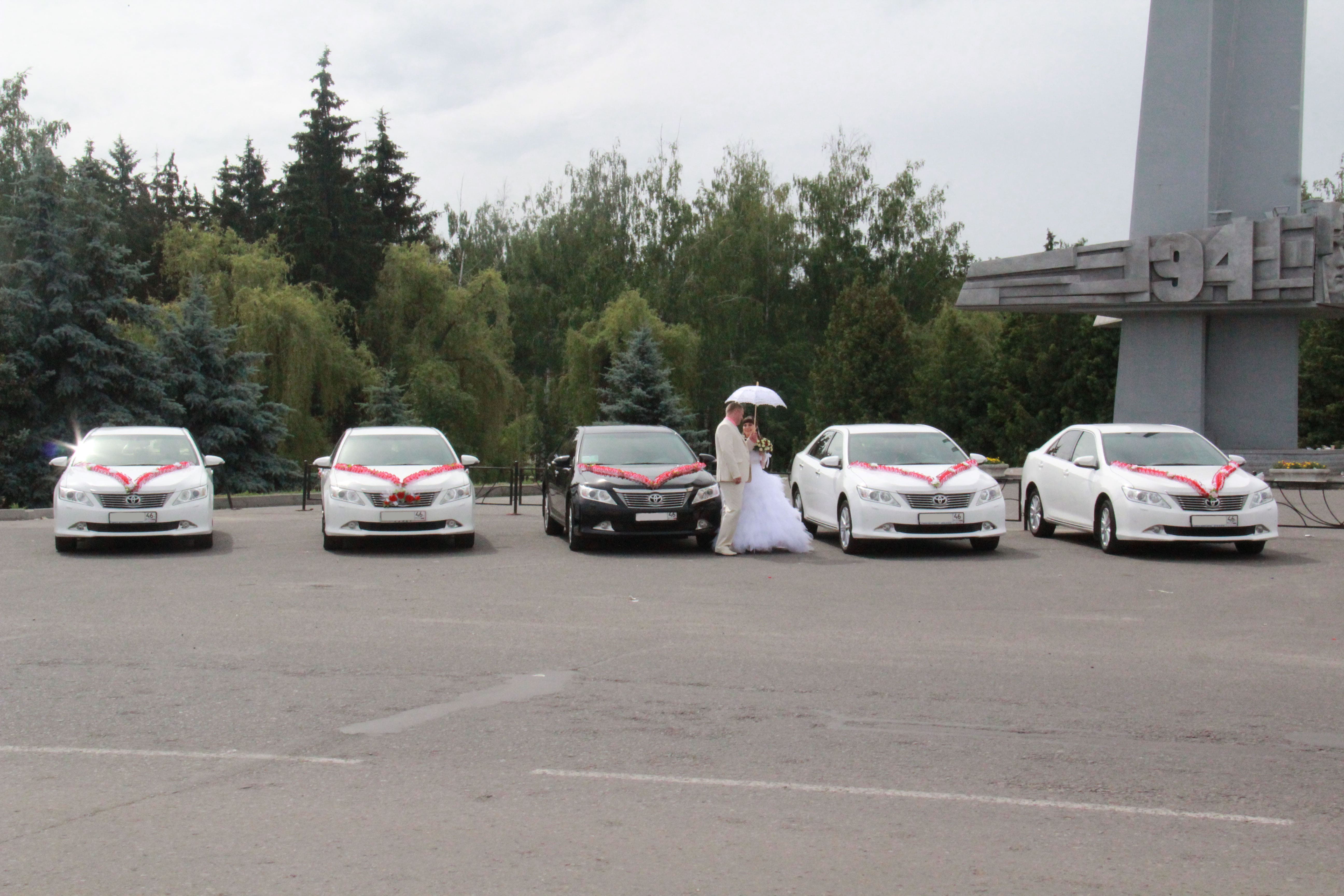 Свадебный кортеж на свадьбу, состоящий из всех белых или черных автомобилей Toyota Camry, запомнится надолго Вам и Вашим гостям.